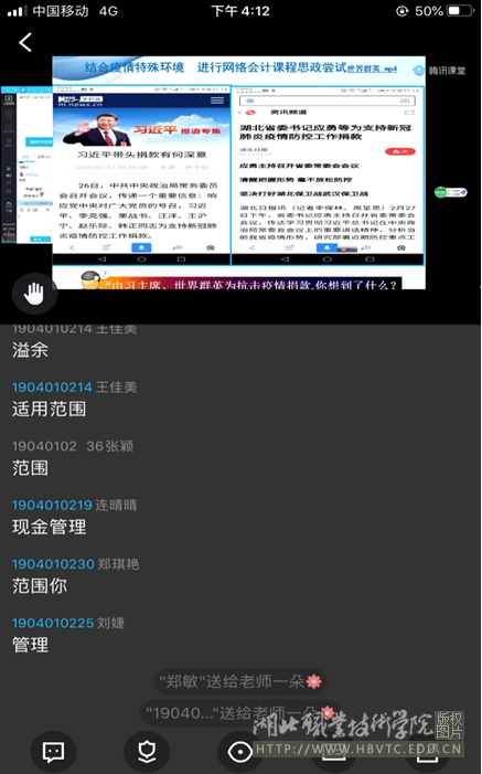 进入周老师的线上课堂,首先是学生的签到界面,接着周老师以思维导图的方式复习了旧课。在讲授新课的过程中,周老师采用了多种教学方法,教学内容结合了初级会计师考证的考点,教学目标明确,教学重难点突出,讲授深入浅出,通俗易懂,结合当前的疫情,将课程思政元素融入教学。周老师的本次课程整体设计新颖,创新点多,体现了以学生为中心的思想,运用了教学新手段、新方法,是一堂很有质量的线上课程。