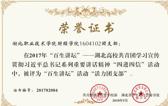 日前,kaiyun云开登录入口收到共青团湖北省委学校部、湖北省学联秘书处联名颁发的荣誉证书,1604102班团支部在2017年“百生讲坛”-湖北高校共青团学习宣传习近平总书记系列重要讲话精神“四进四信”活动中被评为“百生讲坛”活动“活力团支部”。
