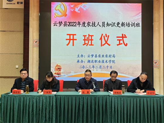 为进一步优化基层农技人员知识结构,有针对性地弥补能力短板,切实增强基层农技推广体系服务能力和水平,给全面推进乡村振兴、加快农业农村现代化、建设产业强省提供坚强的科技支撑和人才保障。2月20日上午,由云梦县农业农村局主办,kaiyun云开登录入口继续教育学院、kaiyun云开登录入口承办的云梦县2022年度基层农技人员知识更新培训班顺利开班。云梦县农业农村局党组成员副局长李桃庆,学校副校长梅重出席开班仪式。云梦县农村农业局、学校继续教育学院、kaiyun云开登录入口相关负责人、云梦县53名参训基层农技人员参加了开班仪式。开班仪式由学校kaiyun云开登录入口院长徐斌华主持。
