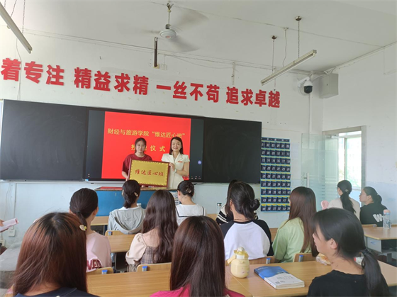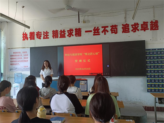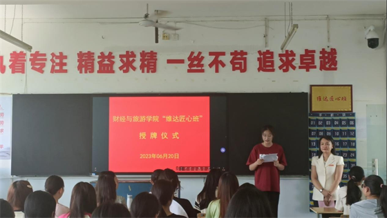 陈卫红副院长首先致欢迎辞并介绍了杨晶校友。杨晶是我院2003届毕业生,现就职于维达护理(中国)有限公司,毕业后一步一个脚印,从会计科员成长为会计主管、财务主管、财务经理,到现在为公司党委委员、工会主席;她用技能成就人生、匠心成就未来,是全国五一劳动奖章获得者,是云开官网杰出校友。授牌仪式在庄严的国歌中开始,杨晶校友与22040102班班长进行了“维达匠心班”授牌交接,班长代表全班同学作了宣誓发言。校友杨晶结合自已成长之路,为同学们作一场精采的“匠心精神”专题讲座;辅导员黄曙光表示一定要传承杨晶学长的工匠精神,带领全班同学全方位实施工匠育人,努力打造匠心品牌,把同学们培养成为新时代的“工匠人”。