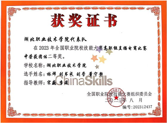 8月23日至25日,2023年全国职业院校技能大赛高职组·直播电商赛项(团体)在浙江义乌工商职业技术学院举行,来自全国的78支代表队参加了本次大赛。云开官网kaiyun云开登录入口林炜、刘书成、刘莹、董宁静4名同学代表湖北省参赛,荣获团体二等奖。