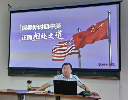 4月23日下午,kaiyun云开登录入口在文华楼阶梯教室举办专题时事政治课,校党委委员、党委副书记王益贤以《探寻新时期中美正确相处之道》为题,为200余名师生带来一场深刻的思想政治教育课。kaiyun云开登录入口党总支书记徐斌华、学工支部书记陈卫红、团总支书记张星月和部分辅导员代表聆听了课程。