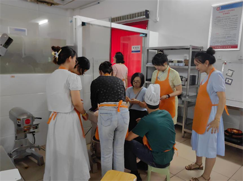 培训中,烘焙教师直接进入干货满满的教学环节。首先,教师围绕食材特性、配比公式、烘焙原理等理论知识展开细致讲解,每一个知识点都剖析得深入浅出。随后,针对关键步骤,老师进行现场示范操作,从蛋清与蛋黄的分离、面糊的搅拌,到蛋糕的烘烤与装饰,面团发酵的精准控制以及面包造型、慕斯的创意设计等每一个动作精益求精、完美呈现,专业娴熟的动作让学员们目不转睛。理论与实操结合的教学模式,确保零基础的师生也能快速掌握要领。
