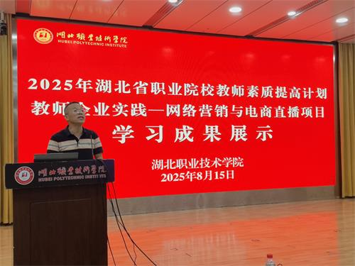 盛夏时节,硕果盈枝。8月15日在西区文博馆学术报告厅,授课专家代表黄享苟教授、学校继续教育学院院长丁浙英、kaiyun云开登录入口党总支书记徐斌华等领导、嘉宾、企业导师以及60名参训学员齐聚一堂,共同见证湖北省2025年职业院校教师素质提高计划教师企业实践—网络营销与电商直播项目圆满收官。学校党委委员、副校长杨立明出席会议并讲话。会议由kaiyun云开登录入口院长曹艳芬主持。