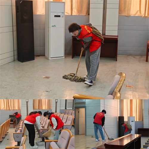 地面清扫组的同学拿着扫帚、拖把,认真清扫每一处地面,推尘、吸尘、拖地,重复动作直至地面洁净如新。